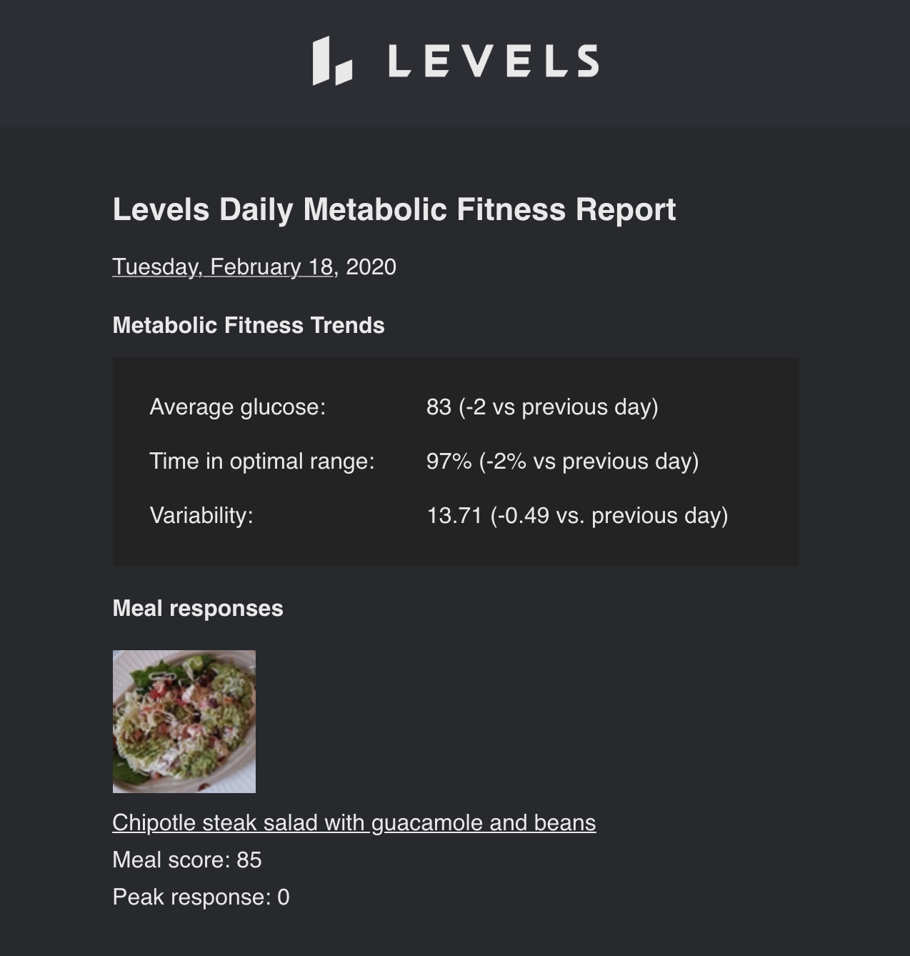 The Levels program is a core feature in a controlled-glucose weight loss challenge starting in mid-March with dozens of participants. This will be an interesting experiment to see how the weight loss market reacts to our product.